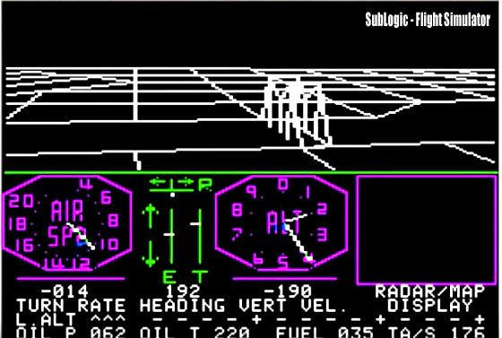 These games were simple and quick to play (you had to insert more coins if you wanted more) and in all sense of the word where Slot Machines. However, serious strides where being made to use the technology for practical flight applications that in the late 70's, graduate student Bruce Artwick made his thesis project by creating a 3-dimensional flight simulator using FORTRAN (formula-translator) language programming on the then newly released Apple2 micro-computer. The program, though a very far cry from the flight sims available today was the first flight simulator that could be run and used in the home.