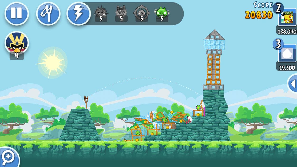 Each birds have their own special abilities that can become a big advantage in completing levels depending on how you use them. There is the basic red bird named Red that is the standard attack that you just throw and deals normal amount of damage, then there is also Chuck that can dash mid-air when executed, Blues is a tiny blue bird that can shoot three versions of itself when activated, Matilda is a large white bird that can shoot eggs below, then there is Bomb who can self-destruct when activated, and the giant Terence who dish out massive damage than Red when thrown. At a start of a level, there will be different set of birds that will become available and you cannot switch to different birds as they can only be used in a certain order.