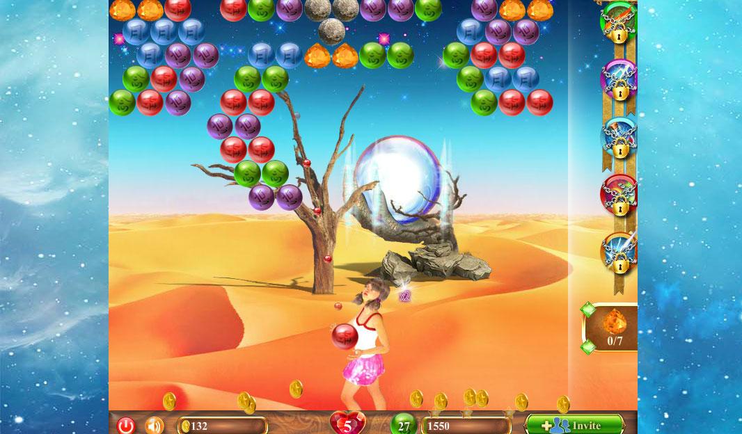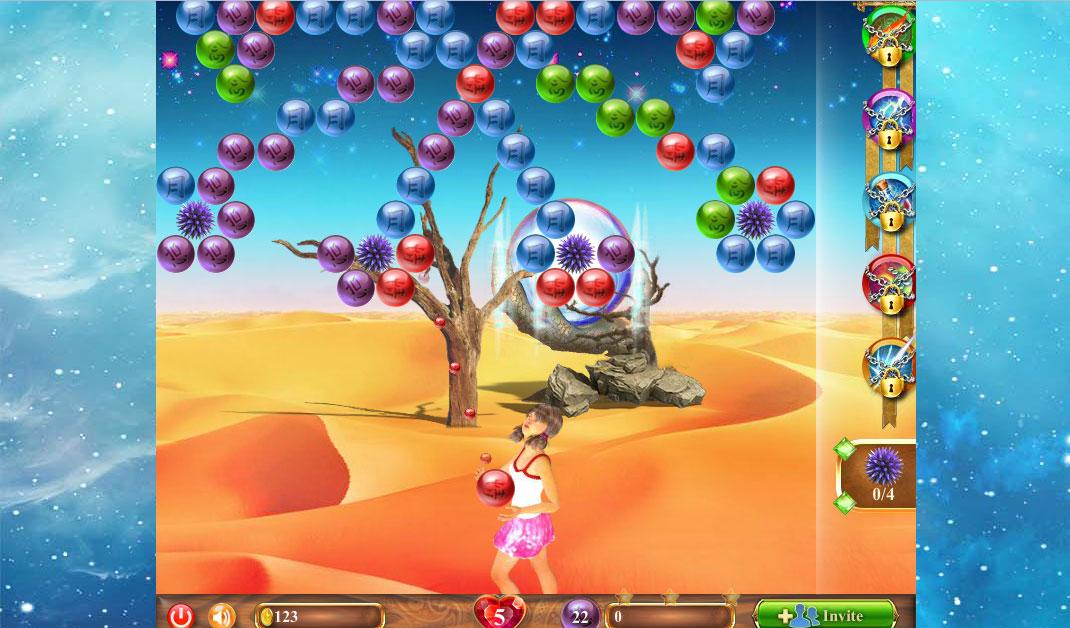 Join in the fun in this exciting sequel to the popular bubble-shooting game, Bubble Quest 2! Match 3 or more bubbles of the same colors in this game and collect the shiny gems released from the bubble traps! Get a long chain of combo going and watch in amazement as your score soar beyond the 3-star limit! Don’t break that combo though or your score will plummet to the ground just as fast! You can even have fun with special bubbles, such as fireball, lightning and stardust that will sometimes replace a random normal bubble when you have a long combo or you can also buy them using in-game money! The game also has plenty of interesting obstacles that do make the game so much challenging! If you’re up for a challenging, bubble-shooting puzzle game, Bubble Quest 2 is the latest and hottest game that is perfect for you! Play it now!