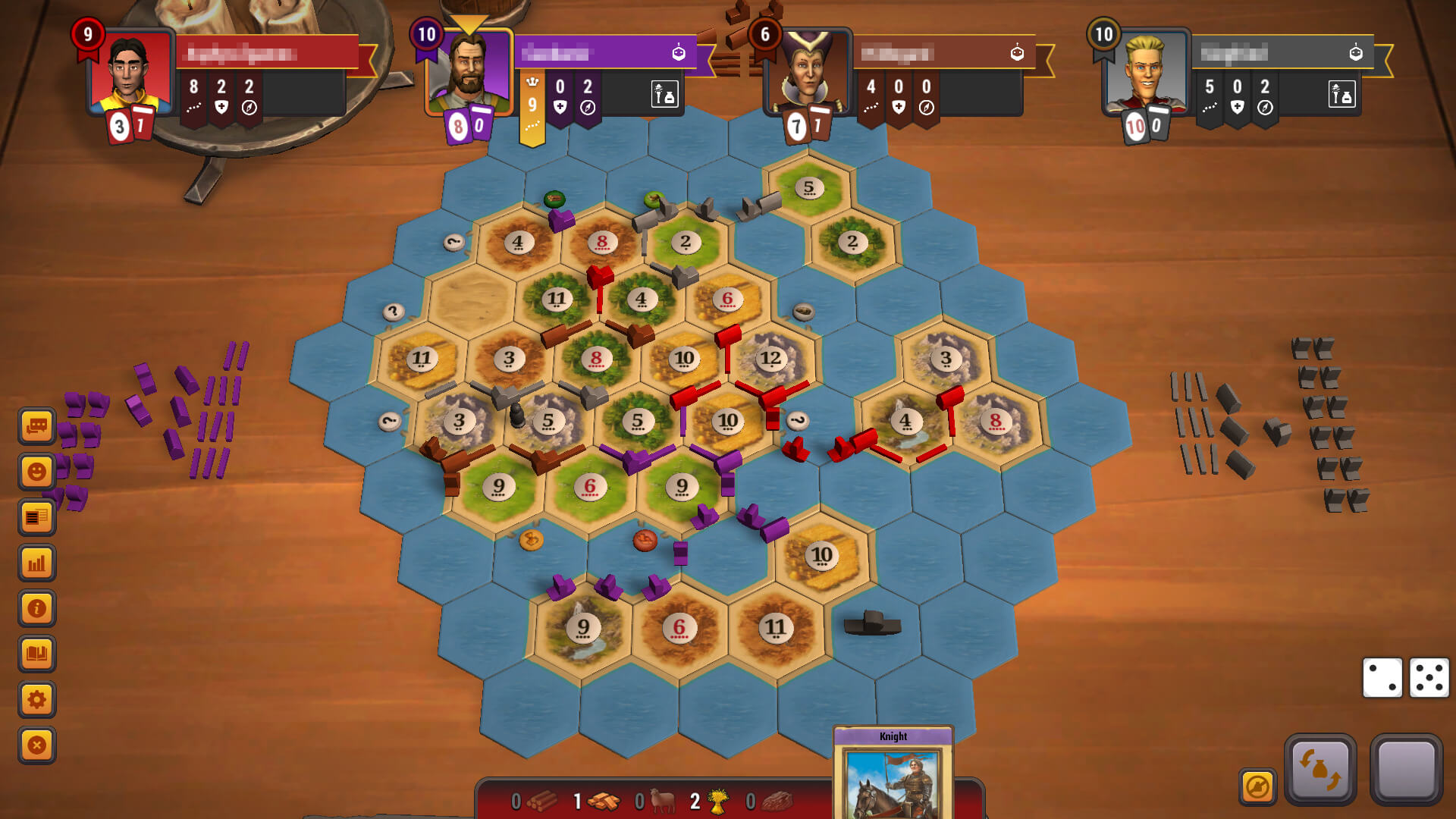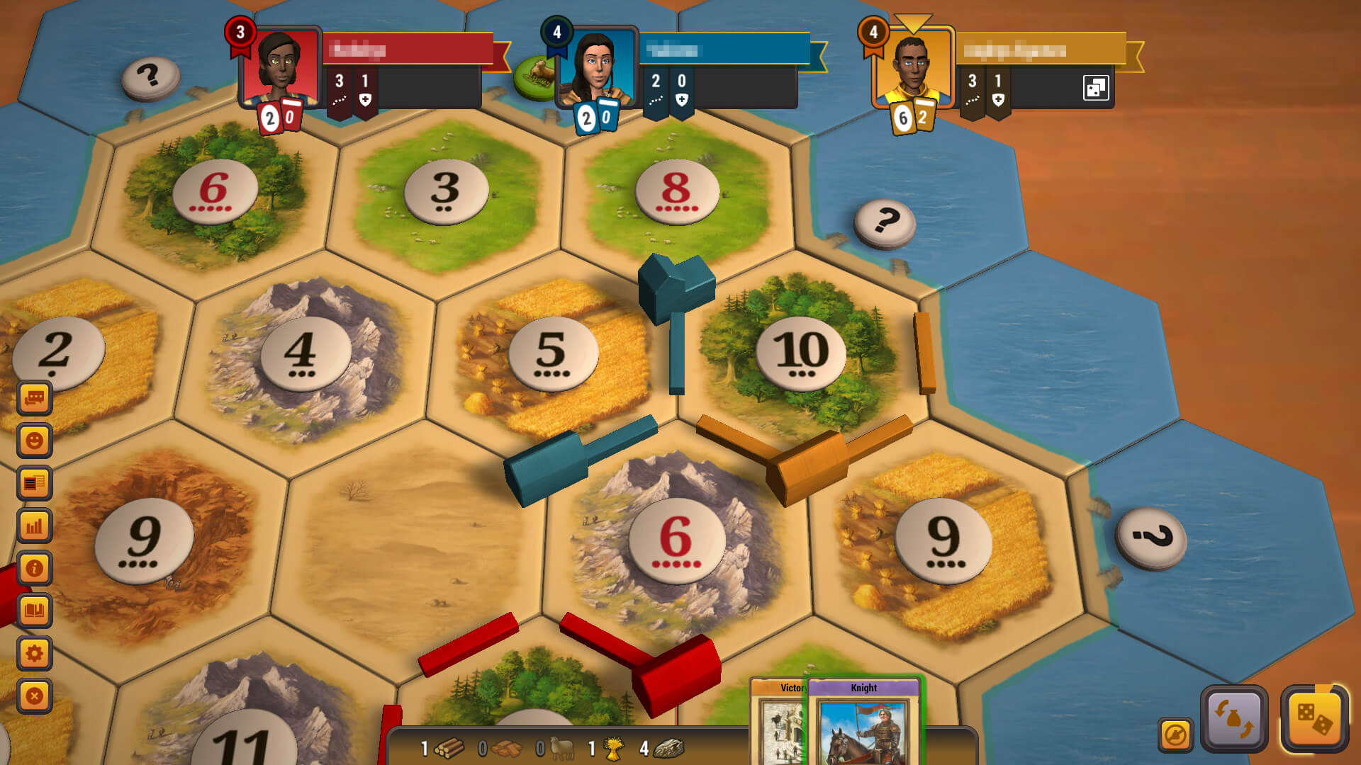 Other than buildings, resources card can also be used for buying Development cards, which cost one grain, one wool and one ore each. These Development cards are not to be underestimated, as they can easily turn the tables if played appropriately. There are five types of development cards in Catan, namely Knight, Road Building, Year of Plenty, Monopoly and Victory Point card. Players that play the Knight card will allow them to move the robber, gaining the abilities as explained above but without the rule of discarding cards if one has more than 7 on hand. Road Building cards allow the player to build 2 roads for free instantly. Playing the Year of Plenty card awards the player two resources of choice, while the Monopoly card allows the player to take all resource cards of a single resource of choice from all the players in the game. To win the game in Catan, players have to accumulate certain amount of Victory Points (VP), and the Victory Point development cards can contribute to that. Other than that, one settlement provides one VP, while one city provides two VPs. The first player who plays more than three knights will be awarded the Largest Army card with 2 VPs. The first player who builds five or more continuous road segments will be awarded the Longest Road card with 2 VPs. However, other players can claim these two special cards from the current holder if they have more knights or longer roads.
