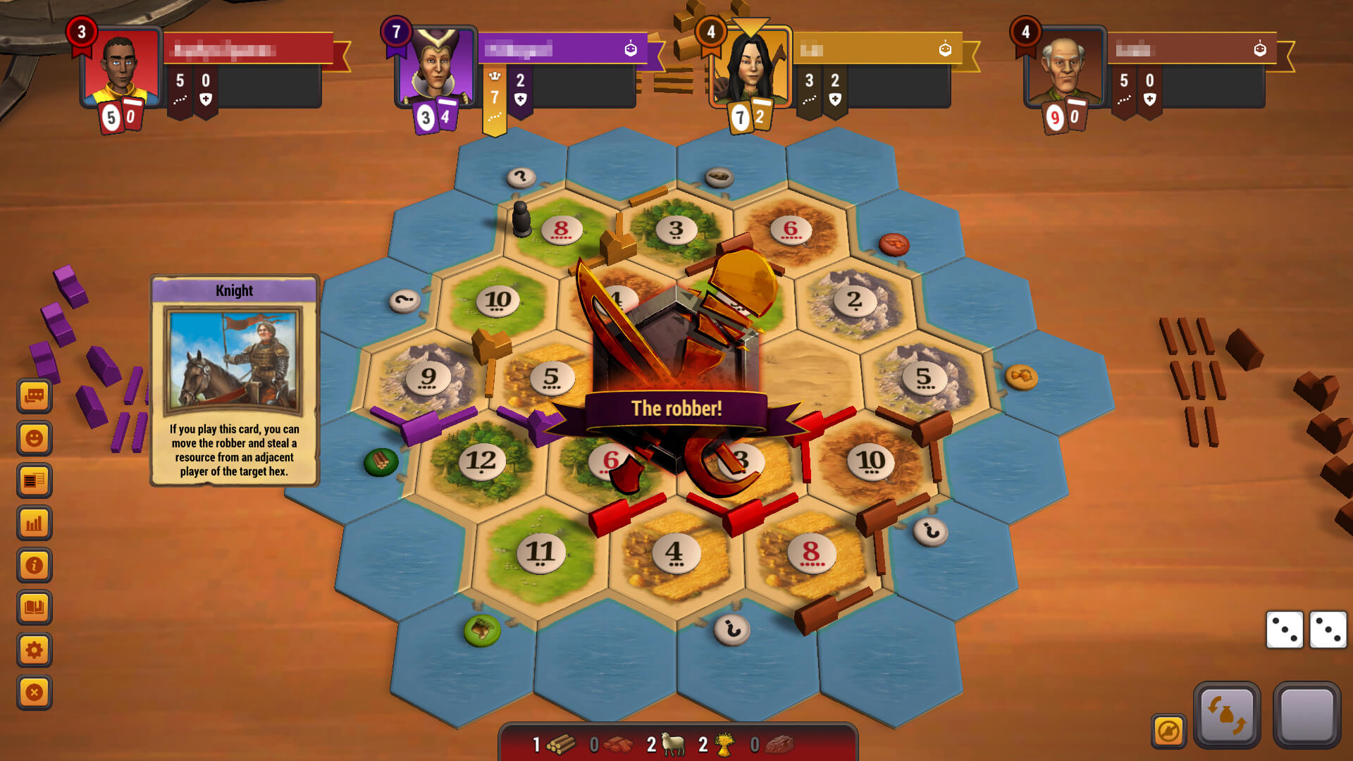 The game goes by rounds, and each round starts with a pair of dice roll. Each hex tile on the map is labelled with a number, from 2 to 12, which represents the result of the dice roll. Players gather resources from the hex tiles if they have a settlement or city on the tile that has the number of the rolled dice. In a way, Catan is a game of probability, and the probability of two dice getting the number 7 is the highest, followed by 6 and 8, then 5 and 9, and so forth. Hence, it is best to build your settlements adjacent to tiles with these numbers. However, there are no tile with the number 7, as rolling 7 will activate the Robber. This Robber starts on the desert tile in the beginning of the game. When a player first rolled 7, any player must discard half of their resource cards on hand if they have more than 7 cards, and the player who rolled the dice must move the robber to another tile of choice, which subsequently blocks the tile from producing any resources until the Robber is moved again. Then that player is able to steal from another player who has a settlement or city adjacent to the robber's new location.