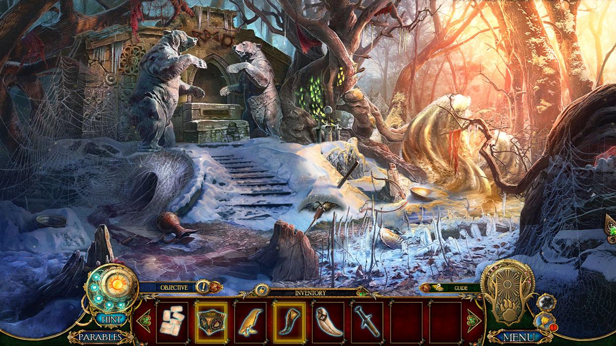 Being a “Dark Parables” game, this game has quite a lot of interactive items that you can... well, interact with. Some items can be viewed in more detail when the magnifying glass cursor is present, while some items, as indicated by the hand-shaped cursor, can be picked up and stored in your inventory for use in certain locations as marked out using the moving-gears cursor. There will be times when you can combine the items in your inventory to obtain a custom item as well. Due to all these interactive items, there will be plenty of “running” about as you attempt to use a new item you’ve obtained in the various interactive locations in the game.