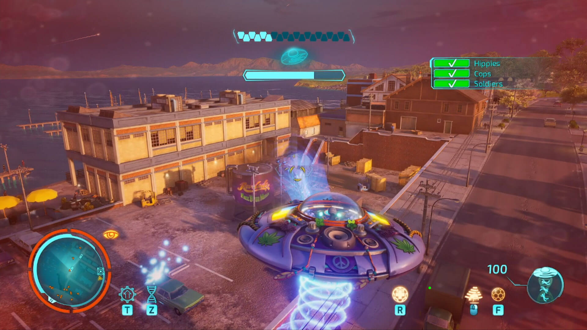 The game really picks up steam once you’ve unlocked your flying saucer, affectionately dubbed as the Saucer. With your UFO, you can really cause some damage with your Death Rays, go invisible with a limited-time invisibility cloak, or even “abduct” humans with your vacuum-like suction device which will allow you to use the genetic materials harvested to upgrade Crypto’s various abilities.