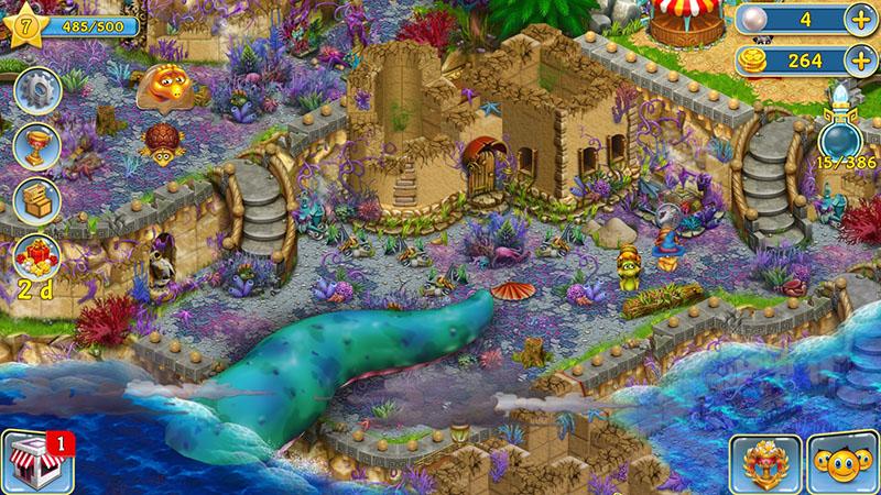 Sunken Secrets adds a unique spin on farming with its interesting location – under the sea. With most actions based on magic, you need to build magic fountains and other magic-producing structures. You can then collect magic and start restoring buildings, removing objects caused by the Sea Witch’s curse and bringing cursed inhabitants back to human form. Then, the farming fun begins. Plant and harvest fruits and other crops and turn it into beverages and food items using different machines.