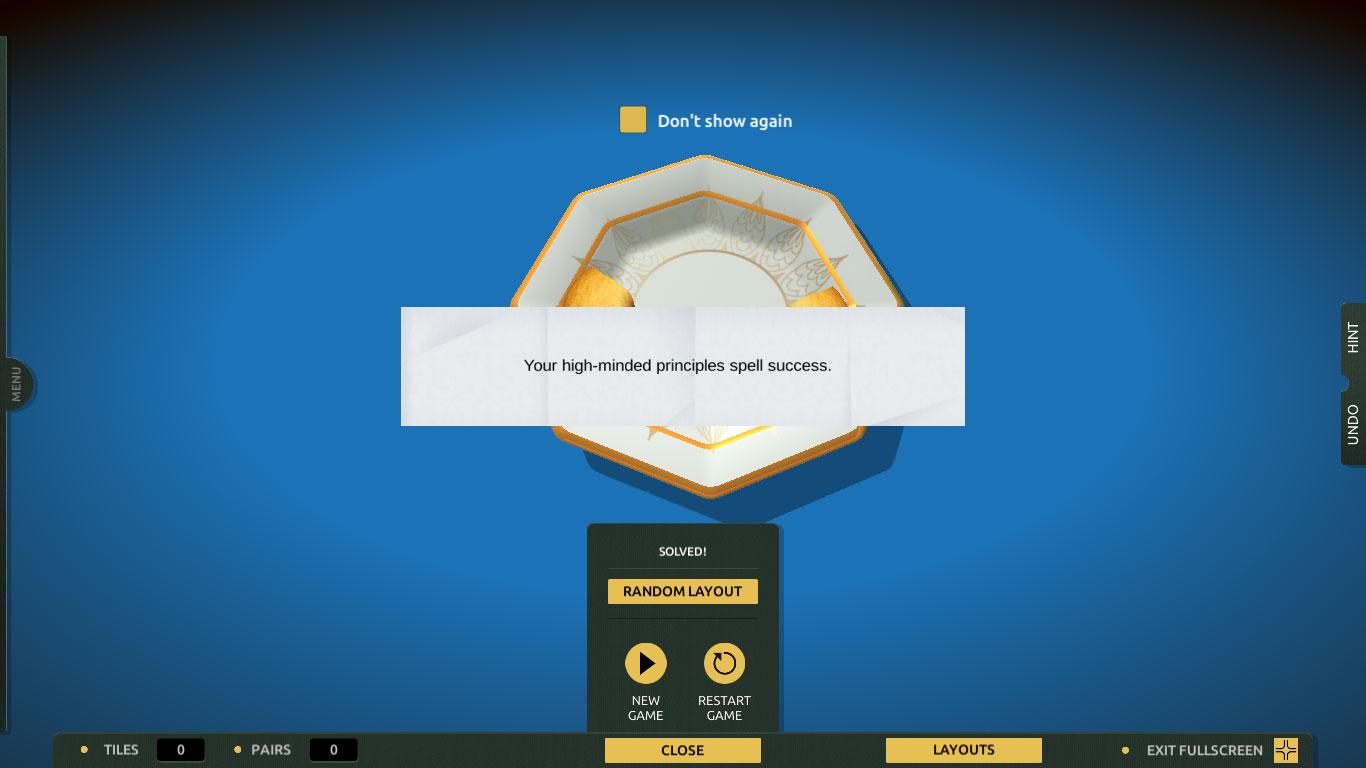What I enjoy the most though is that once you’ve successfully cleared a board, you’ll be rewarded with a fortune cookie which will leave you with a random wise old saying. However, if you just want to play mahjong, you can disable this feature from the menu. There are unlimited hints and undos for you to use as well, if there is a need. They are located on the right side of the screen.