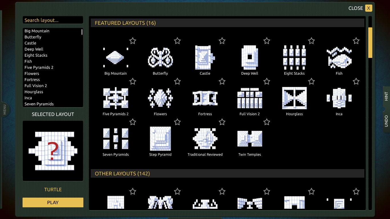 Another great thing about playing mahjong on this site is that the variety provided is simply astonishing for a completely free game! TheMahjong.com boasts of offering more than 150 different layouts, ranging from the traditional Turtle layout to the more modern Dude or F-15 Eagle (jet fighter-themed) layouts. You can easily search for a specific layout you like, browse through all the available layouts through their Layouts interface, or you could just go with a random layout and try to solve whatever layout you get. Interestingly, you can even “heart” a layout you’ve enjoyed so it will be listed under your Favorites.
