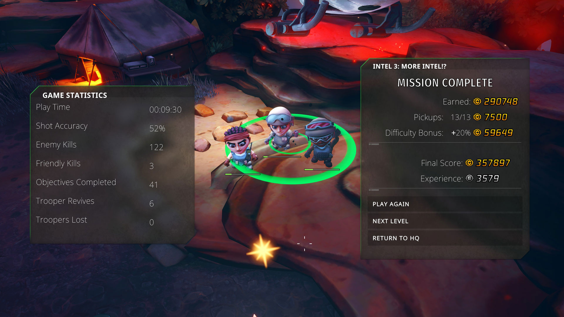 At the end of the day, your score points will be totaled and you’ll earn a set amount of Experience tokens to spend later at the HQ. These tokens are very important since you’ll need them to replace dead troopers in your team and upgrade your troopers at the Armory in the troopers’ HQ. Upgrades are crucial since enemies do get more challenging later on. Plus, your troopers move quite slow at first and that the dodge cooldown can be maddeningly long sometimes. With the proper upgrades, you can slightly alleviate these issues so that they are more bearable. You might also want to know that even if you failed a level, you will still earn some amount of experience so you can easily upgrade your troopers and attempt the level again.