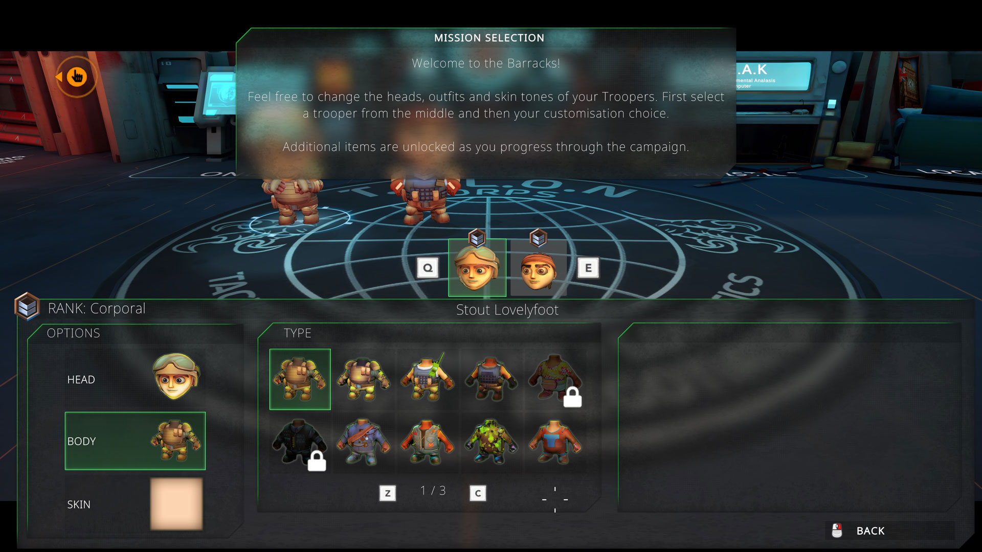 Tired of all the action and want to take a break? Well, you can kick back and relax at the Barracks in the HQ and just have fun customizing your tiny troopers. You can change their looks by changing their heads, body, and skin color. You can unlock new cosmetics for your troopers by picking up drops while on missions, some of which are hidden so you really got to go look for them.