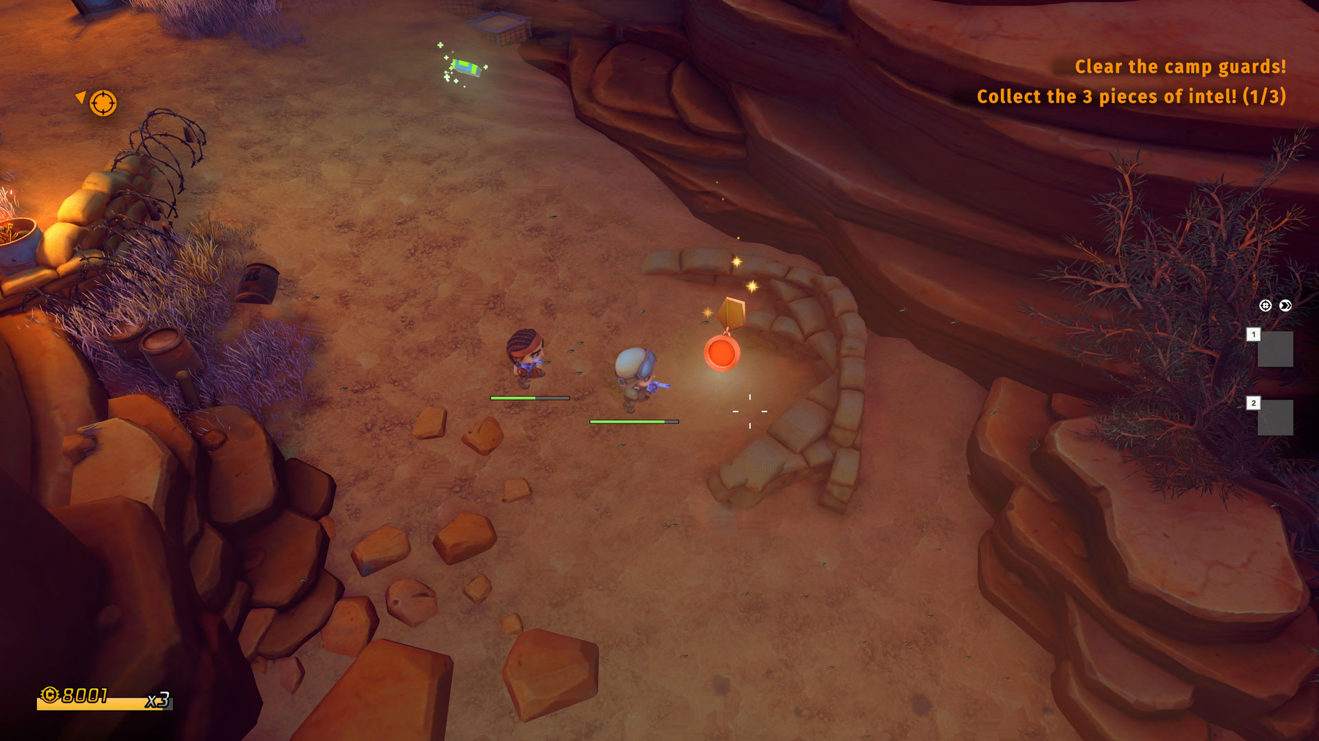 Tiny Troopers: Global Ops is designed with co-op (up to 4 players total) in mind and has the facilities to support both online and local co-op. However, if you’re more of a lone wolf, the game does give you AI-controlled troopers to recruit to your team. They aren’t the best shot or teammates due to the often-fatal situations they will sometimes put themselves in, but it’s sometimes better than nothing. You can always choose to not revive your fellow AI teammates once they are down for the count, and not have them replaced at the HQ if you simply want to play the game completely alone.