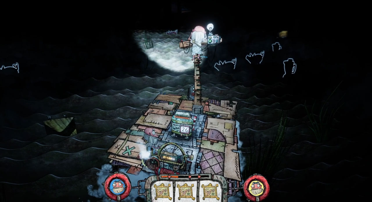 There are also moments where you’ll need to work the spotlights at the top of the mast as the skies go really dark really fast. This will scare away the nightly creatures in the dark – they look oddly like the spiders from Don’t Starve – as well as giving the steersman a way to see where to steer the raft to.