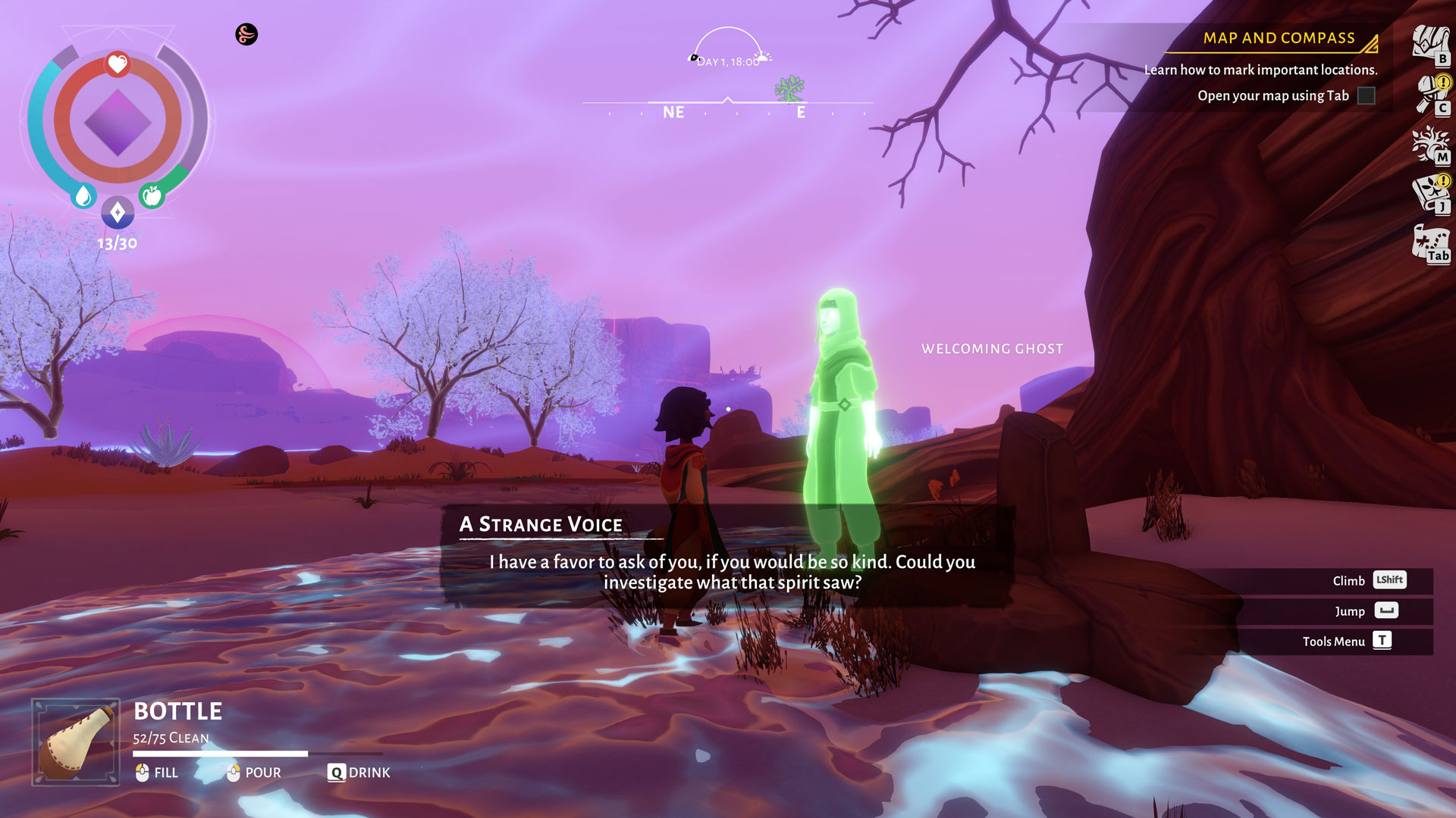 The game began with an introduction that doubles as an interactive tutorial. Here, you’re introduced to your character – a young boy who somehow found himself trapped in a small oasis in the middle of a barren desert – as well as a mysterious yet helpful guide, a glowing shard that can speak. With the guide’s help, you’ll learn not only how to navigate the harsh, sun-beaten landscape, but also to explore new areas, figure out what happened to the world, uncover stories of the people before, and ultimately, bring life back to the barren lands.
