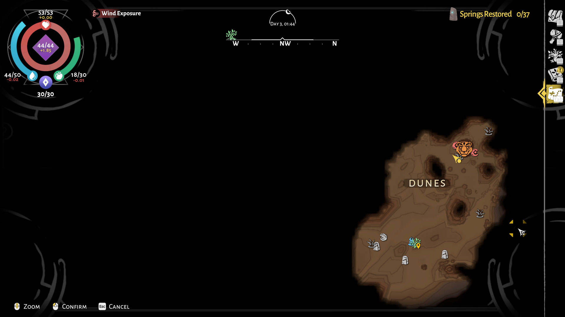As a survival game as well, you’ll need to keep a watchful eye over two main survival criteria in Wildmender – your hydration level, a.k.a. thirst, and your satiety. Having too low of either one usually spells disaster, especially during long trips away from your oasis, even if it’s during the night.