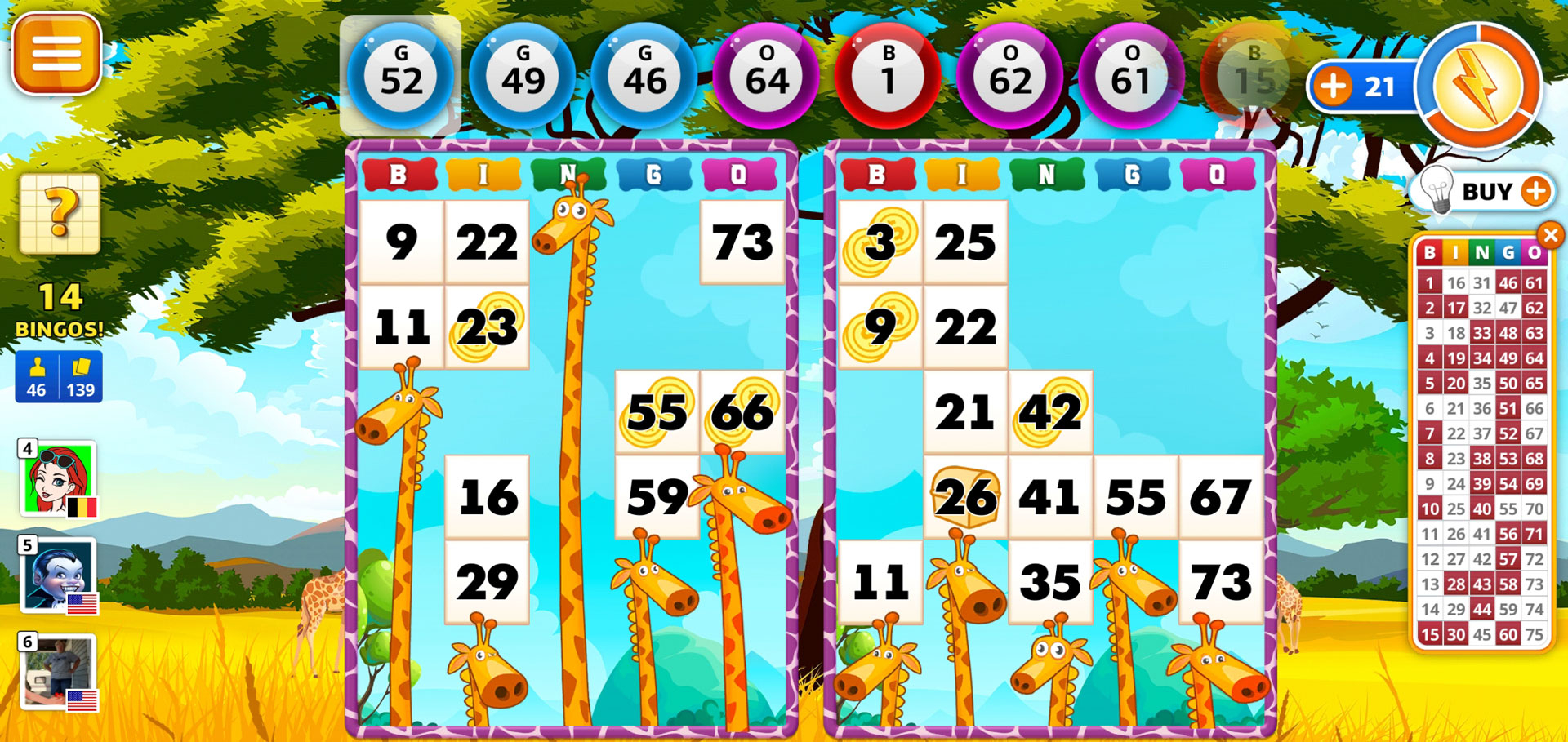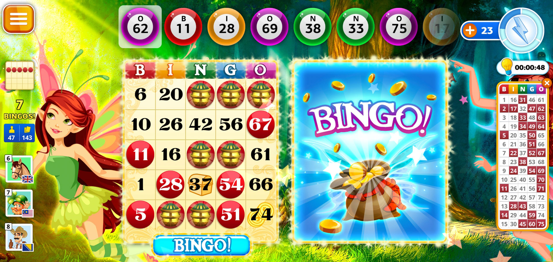 One such feature is the booster. Every correct daub you make charges up your booster meter, with three correct daubs netting you a random booster. The booster you get can range from getting doubled experience points for your next daubs to getting random “wild daubs” which function just like wild cards in UNO. Some numbers on the card will also grant certain rewards like coins or reward chests when daubed, as indicated by the icon, if there’s any, behind the number.