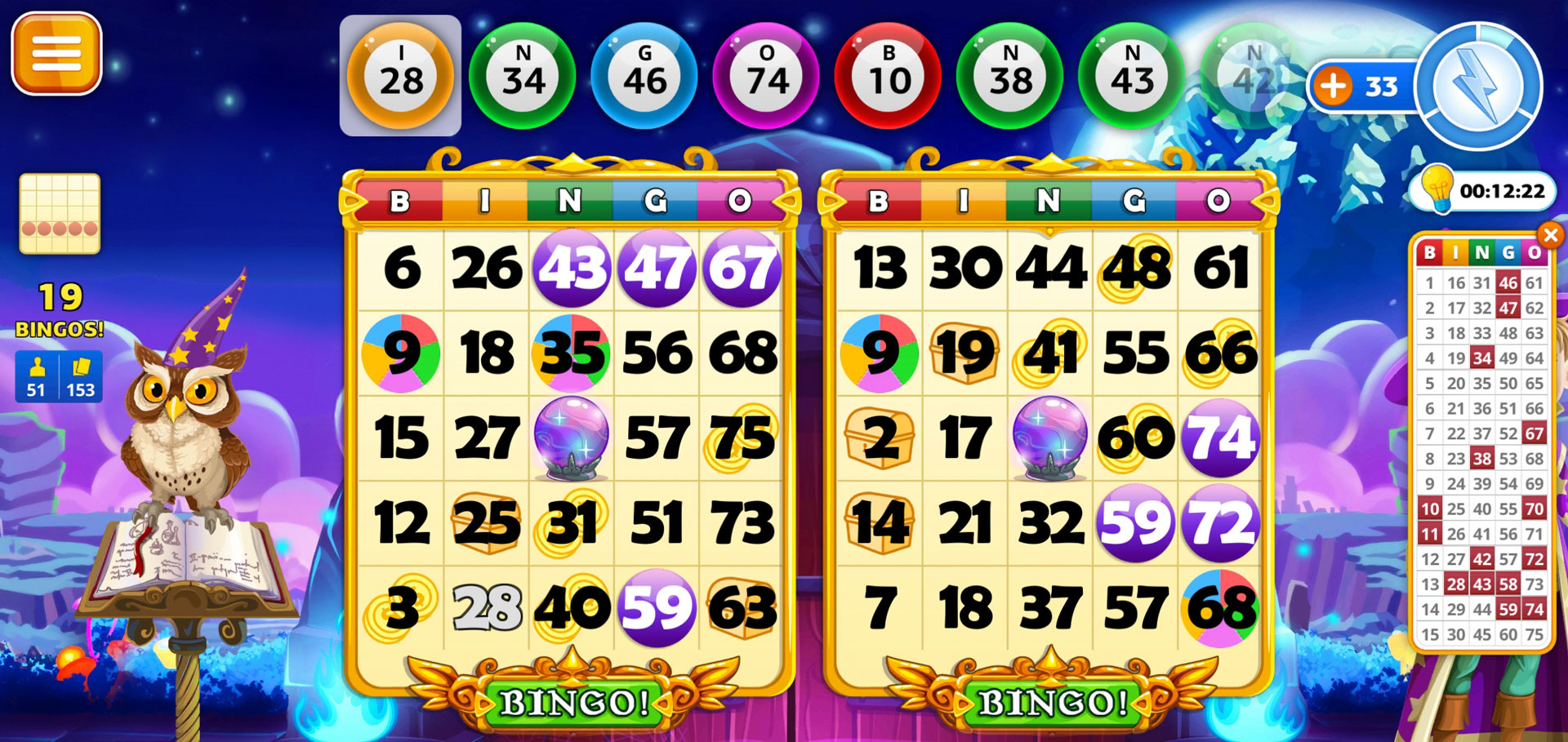 In this game, every bingo card you buy costs bingo chips, or “bingos” for short. You can buy up to four bingo cards per game. To get more chips, you can collect some for free daily or complete the daily tasks to earn them. The core of the gameplay is still bingo as you know it – a number is called; you daub your cards accordingly, and if you get any of the winning patterns, of which there are many, you’ll win a bingo. However, there are some refreshingly new aspects to the game that made Wizard of Bingo so much more interesting.