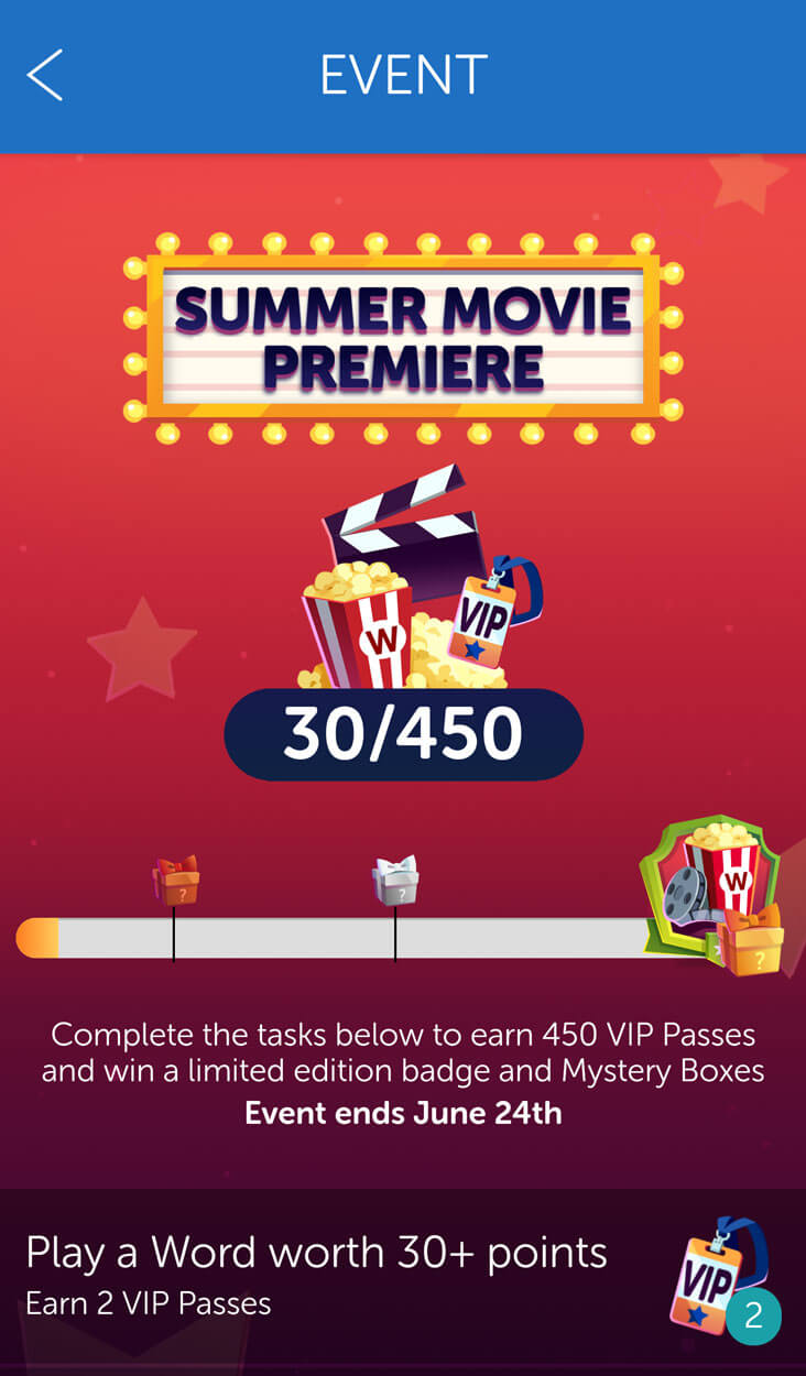 Most of the time, Words with Friends 2 will also have some ongoing special event whereby you can gain event points for fulfilling a certain criterion. If you get enough event points, then you may stand a chance of winning something amazing, such as free passes to summer movie premieres.
