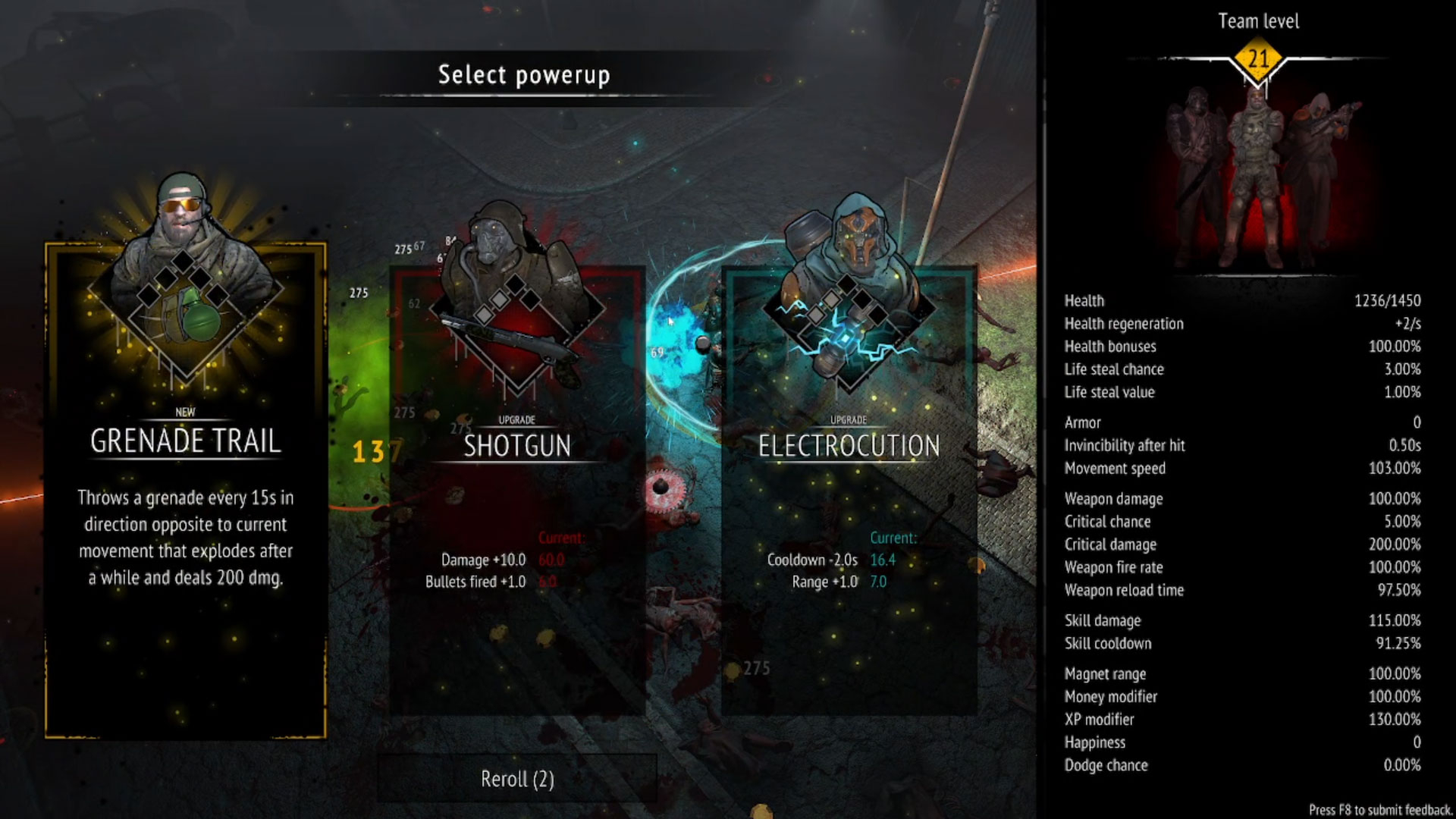 The class-linked powerups can be quite powerful, however, as they include class-based special abilities – most of which are passive and will trigger on their own after their respective cooldowns – that can really make quite the difference when the zombie horde gets thicker and tougher (they “level up” as well, spawning new varieties and tougher variants of the zombies you’ve fought before) as you advance. For instance, the Tank has this Sawblade Drone ability that, when unlocked, will grant your team a passive way of damaging zombies that got too close to your group. There’s also a helpful panel on the right that shows your team stats, like its total health regeneration or weapon damage, as well as the team level.