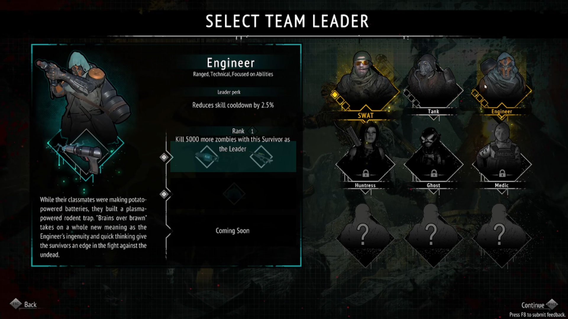 To start playing, you’ll need first to choose a character class as your “team leader”. As mentioned above, in this game, you’ll be able to add new team members to your team, up to a total of three members, including yourself, the team leader. Each class has its respective unique leader perk that will apply to the entire team. For instance, the SWAT improves reload times while the Engineer reduces skill cooldown.